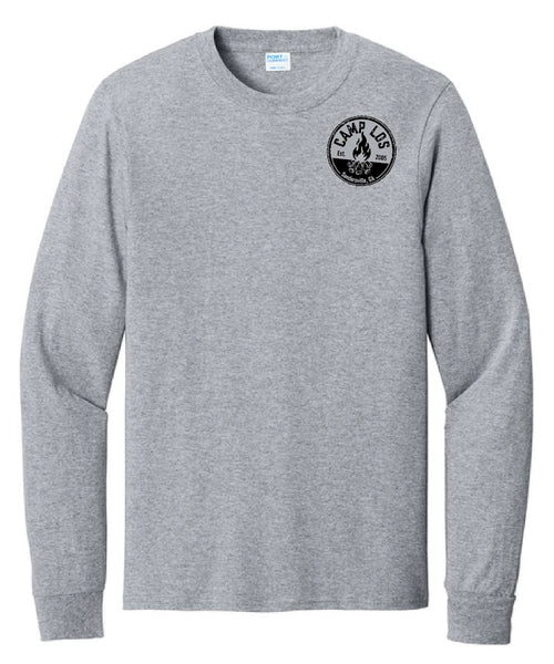 The shirt is a heavy 5.4oz material in heather gray with black printing of the Camp Los logo and the timeless image of Carlos Celaya.